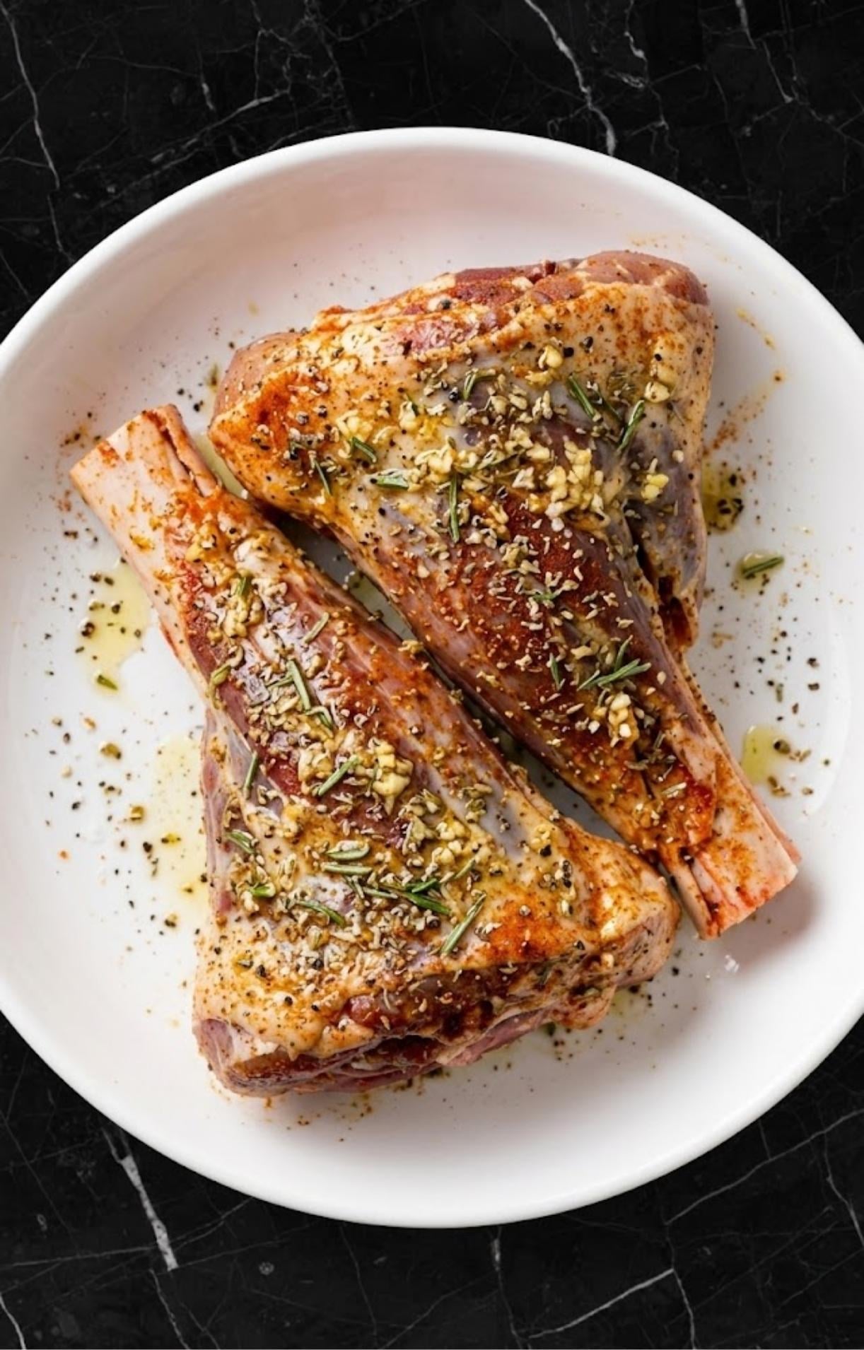 - Rub lamb shanks with olive oil, garlic, oregano, rosemary, paprika, salt, and pepper.