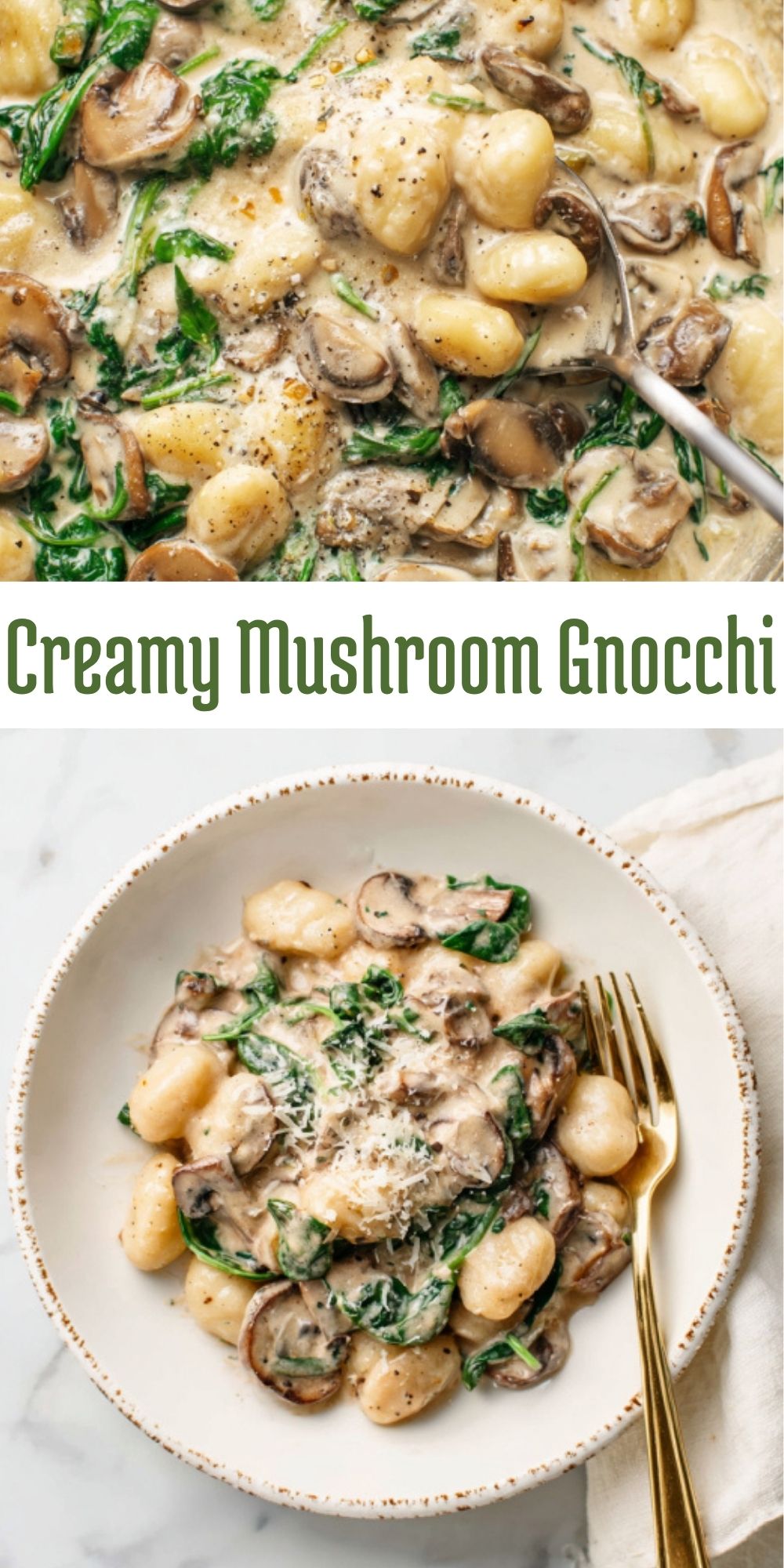 Vertical Pinterest collage featuring a skillet of creamy mushroom gnocchi with spinach and a serving bowl, highlighting an easy weeknight dinner.