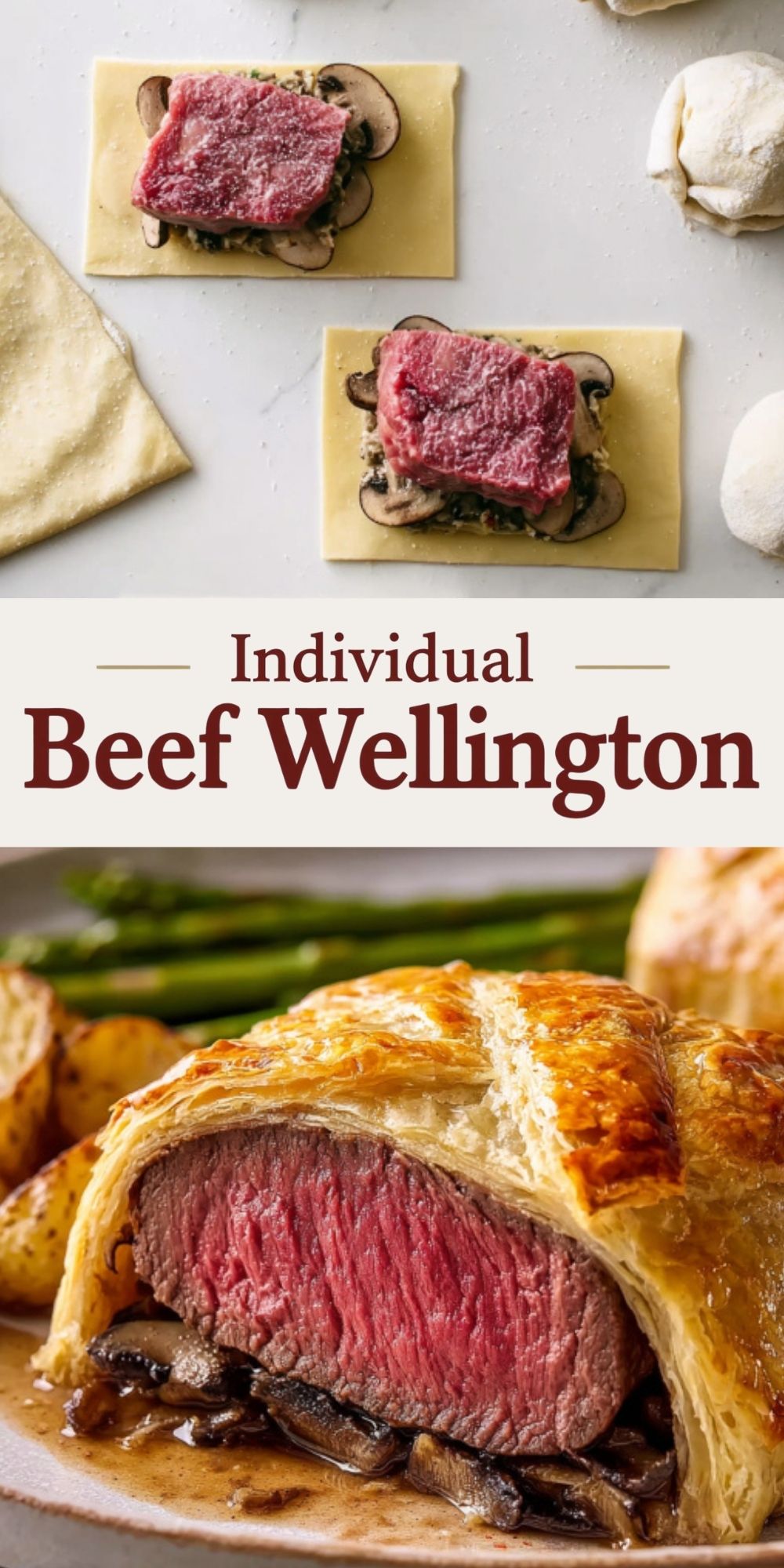 Step-by-step visuals for making individual beef wellington: assembling beef and mushrooms on puff pastry and the finished dish sliced open to show a juicy steak center. Perfect for holiday dinners, elegant entertaining, and special occasions.